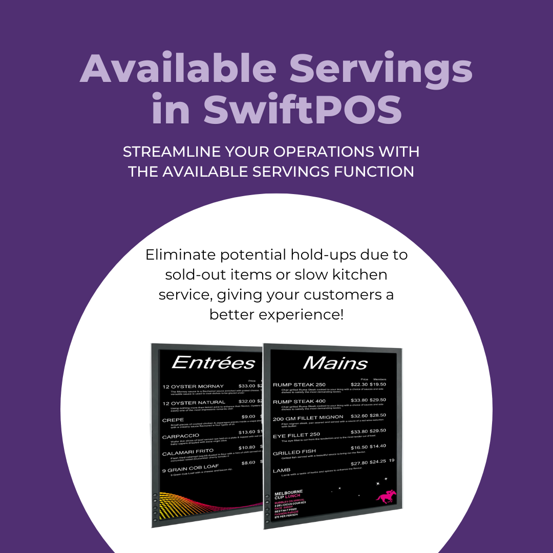 During peak times, hospitality venues are busy and under pressure. A successful establishment and positive customer experience depend on effective organisation and strong communication between the kitchen and Front of House staff. SwiftPOS has a range of tools to assist your staff and guarantee customers have the best experience. The Available Servings function is one of these tools.